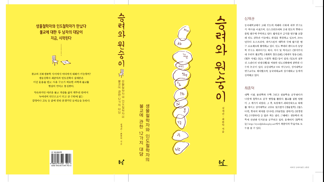 | Jaekwan Shim and Jongduck Choi, Monk and Monkey, Dongeok Press, 2016, in Korean The Dialogue Between a Buddhist and a Philosopher of Biology Chapter 1 Self : There is nothing of Self 17 Chapter 2 Changing Eternality : Not Apparently but deeply Interdependency 41 Chapter 3 Emotion : Emotion without Desires 67 Chapter 4 Esthetics : Memory of Sensitivity to Cold Arts 91 Chapter 5 Expedient : No more Holding, Disposable Ladders 121 Chapter 6 Evolution : No Beginning, No Ending 141 Chapter 7 Culture : East and West 177 Chapter 8 Religions : Varieties of Religions 209 Chapter 9 Collectivism : Religion as Collectives 237 Chapter 10 Belief : From Belief to Knowing 275 Chapter 11 Solitary : Not Avoid, But Enjoy it 311 Chapter 12 Proto-Becoming : Creating From Variations 342 |