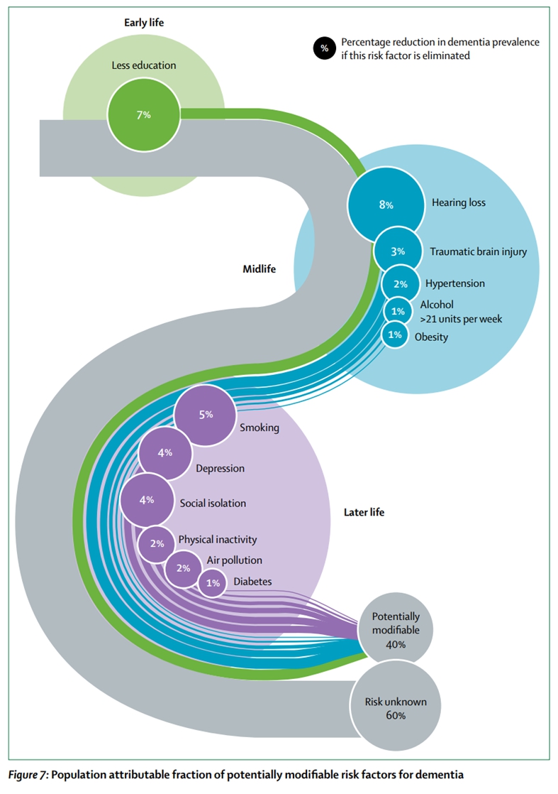 교육 부족, 고혈압, 청각 장애, 흡연, 비만, 우울증, 신체 활동 부족, 당뇨병 및 낮은 사회적 접촉이다.